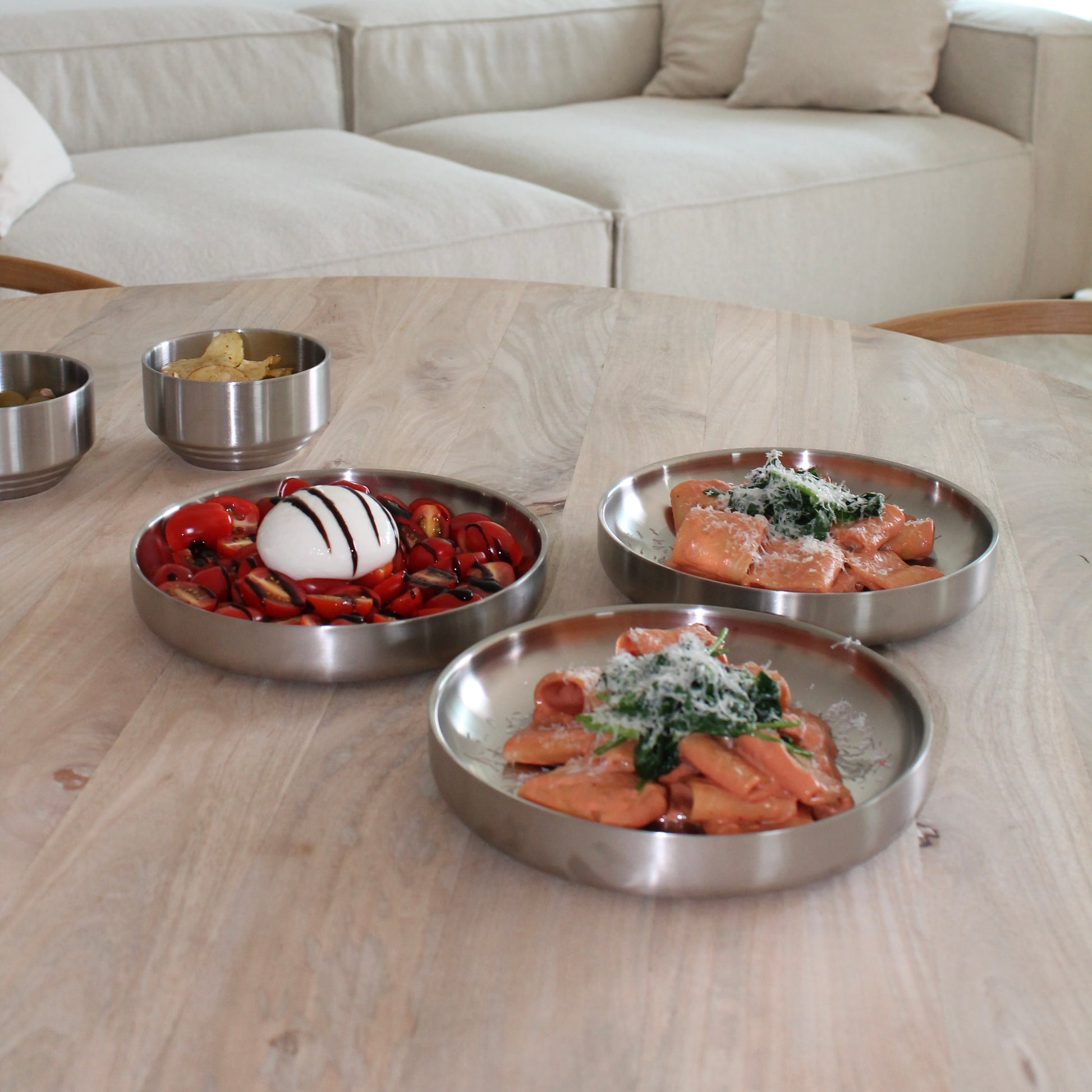 Vores tallerken er skabt med fokus på holdbarhed og stil. Lavet af rustfrit stål og designet med en høj kant og et mat finish, passer denne tallerken perfekt ind i din hverdag - uanset om du serverer en middag for mange gæster eller nyder en afslappet middag selv, vil denne tallerken tilføje et strejf af kvalitet og design til dit bord.